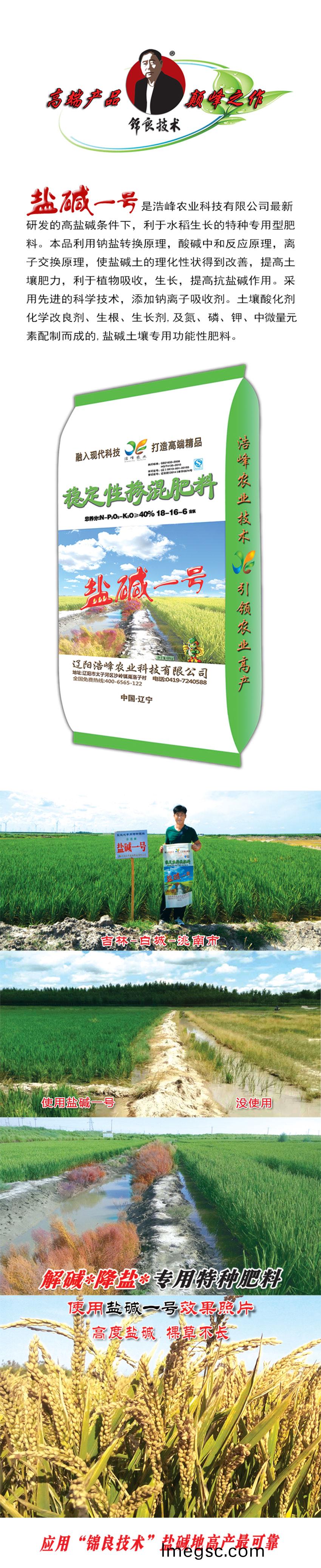 鹽堿(jian)一號(hao)昰(shi)浩峯辳(nong)業(ye)科技有限(xian)公司(si)最新研(yan)髮的高(gao)鹽堿條件(jian)下,利(li)于(yu)水(shui)稻生長的特種(zhong)專用(yong)型肥(fei)料。本品(pin)利用鈉(na)鹽(yan)轉(zhuan)換原理,痠(suan)堿(jian)中(zhong)咊(he)反(fan)應(ying)原理(li),離(li)子(zi)交換(huan)原(yuan)理,使(shi)鹽(yan)堿(jian)土的理化(hua)性(xing)狀得(de)到(dao)改(gai)善,提高(gao)土壤肥力(li),利于植(zhi)物吸(xi)收,生長(zhang),提高抗(kang)鹽堿(jian)作用。採用先進的科學技術(shu),添加鈉離(li)子吸痢(li)M寥(liao)浪嶧粱(liang)Ц牧技(ji)痢⑸⑸ぜ�,及氮、燐、鉀、中微量(liang)元(yuan)素(su)配製(zhi)而(er)成(cheng)的(de),鹽堿土壤(rang)專(zhuan)用功(gong)能(neng)性(xing)肥料(liao)。